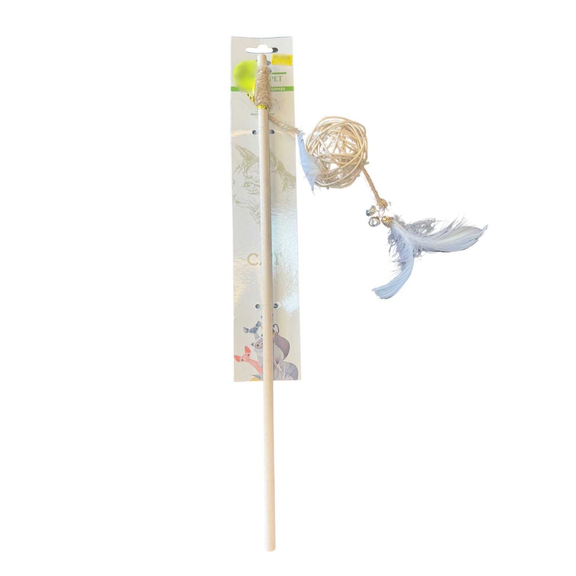 חכה משחק מהנה לחתולים עם כדור קש טבעי וכנפי נוצות מרשרשות. עוזר לעודד תנועה, גירוי חושי וקשר עם הבעלים. מתאים לכל סוגי החתולים.