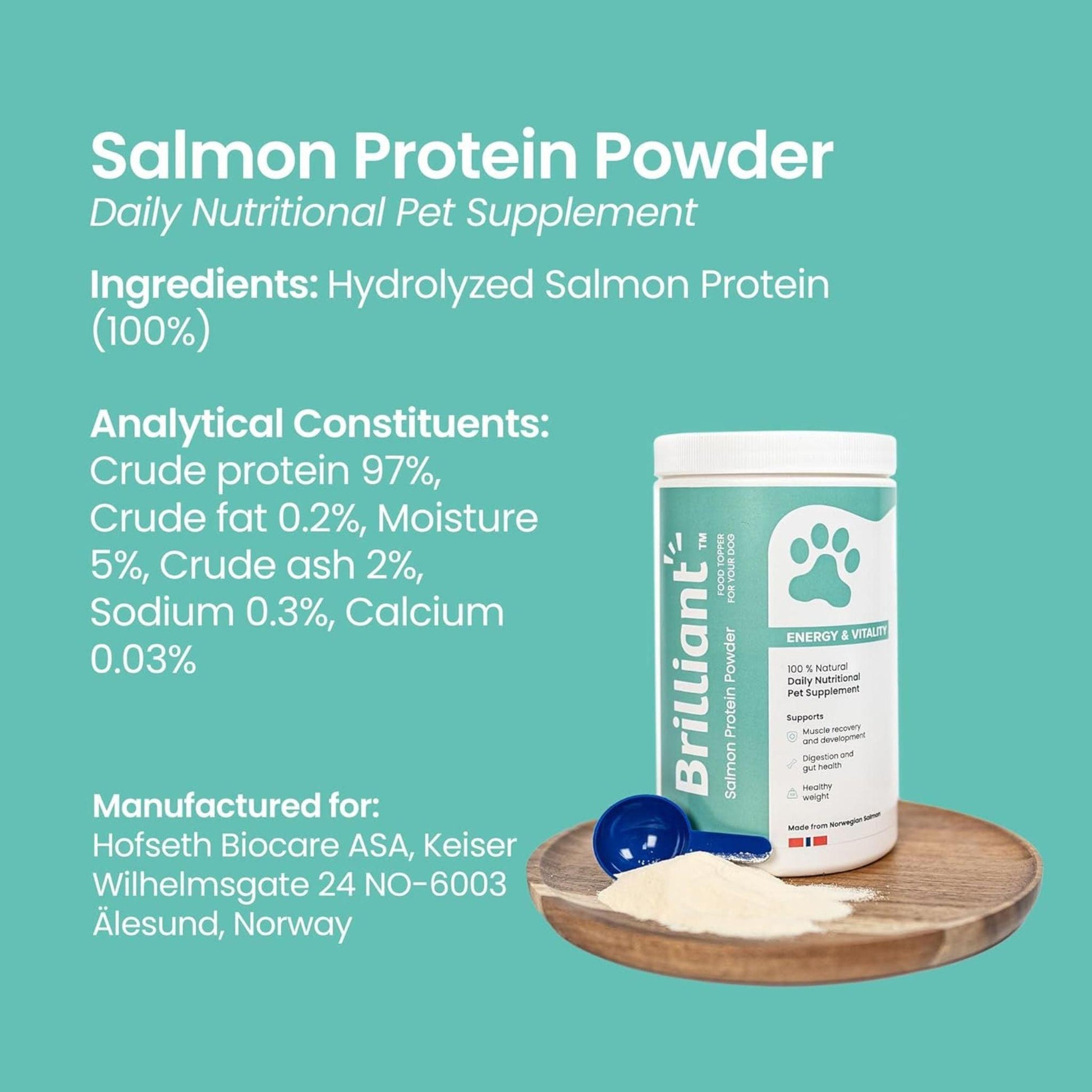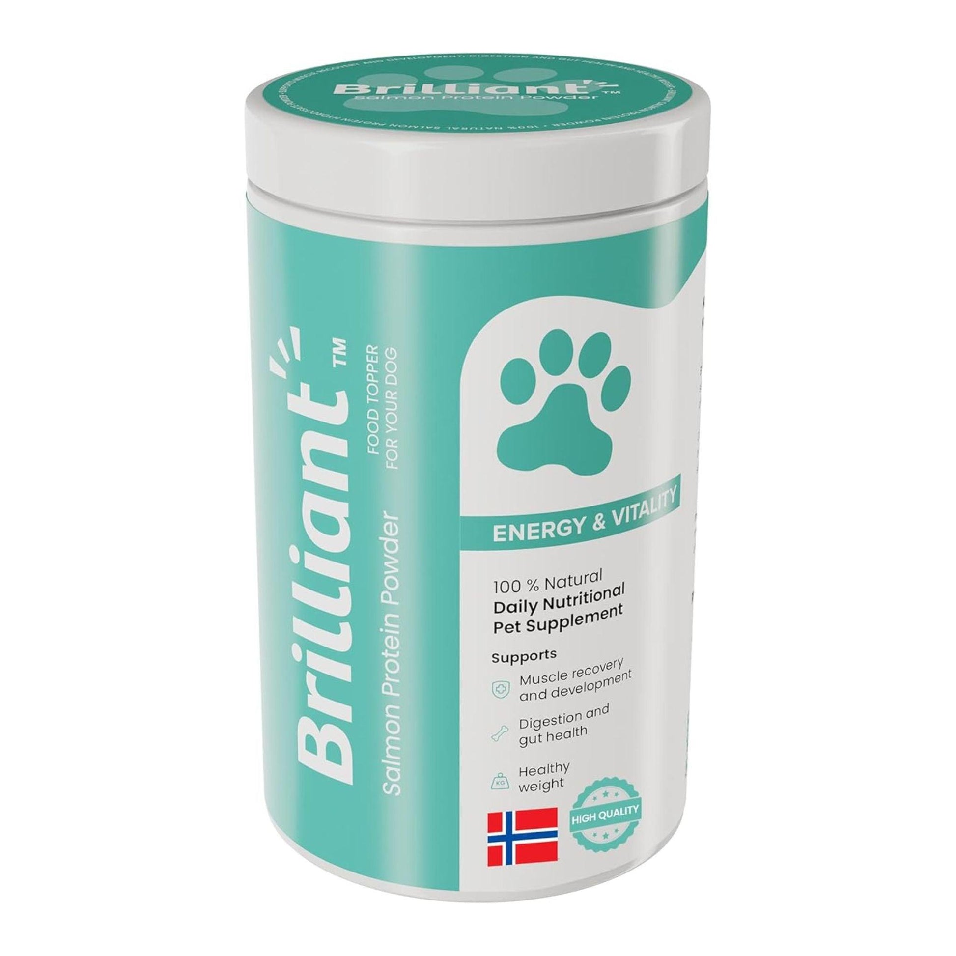 תוסף תזונה איכותי מבית Brilliant המבוסס על חלבון סלמון, לחיזוק מערכת העיכול, איזון פלורת המעי ושמירה על משקל גוף תקין. אבקה טעימה במיוחד, מתאימה לכלבים רזים, גורים או כלבים פעילים הזקוקים לתוספת חלבון טבעית. עשיר בפפטידים של סלמון המסייעים בעיכול, חיזוק שרירים, הורדת כולסטרול ושומנים בגוף, ומכילים נוגדי חמצון חזקים התומכים במניעת סרטן וסוכרת. מתאים גם לחתולים. ניתן לפזר על האוכל או להגיש על משטח ליקוק. מומלץ על ידי וטרינרים כתוסף בריא, טעים ויעיל לכלבים וחתולים כאחד.