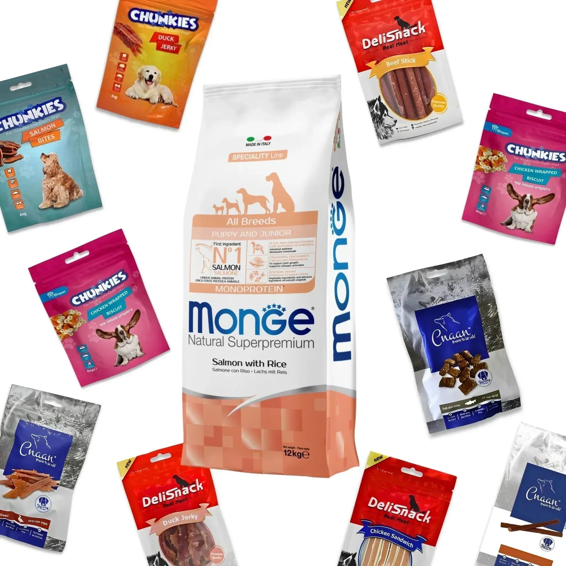 MONGE מונג’ סלמון גורים לכלב 12 ק”ג + 12 חטיפים מתנה