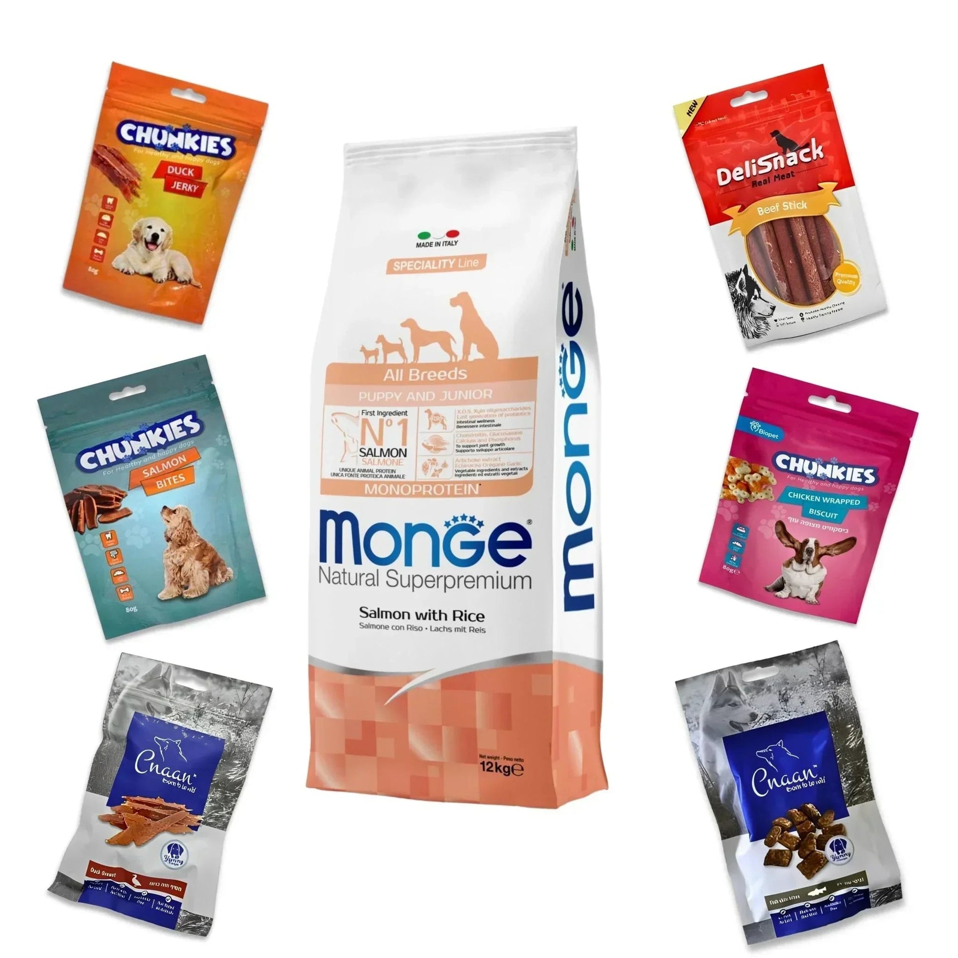MONGE מונג’ סלמון גורים לכלב 12 ק”ג + 6 חטיפים מתנה