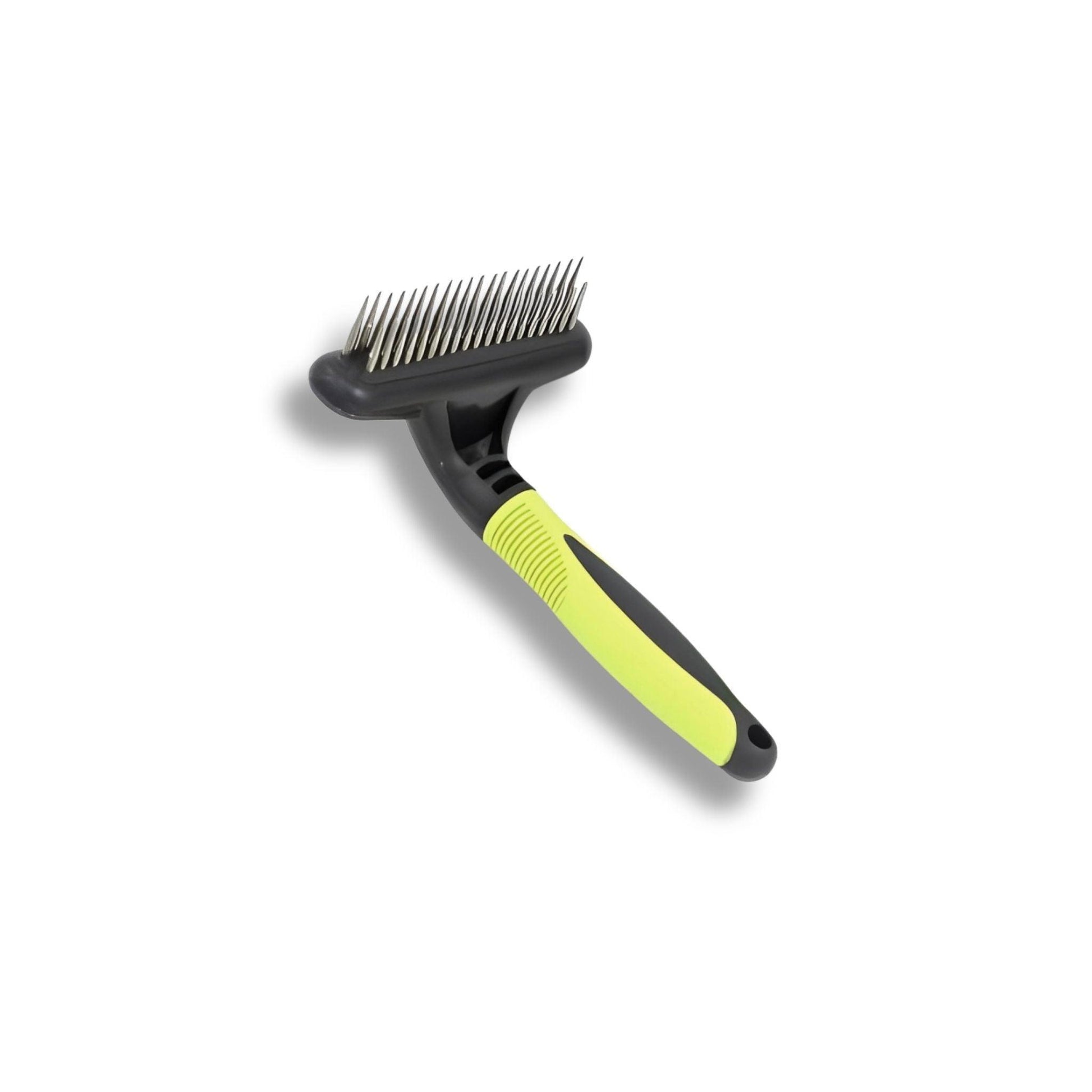 Высококачественная, удобная расческа-грабли для расчесывания вашей собаки с двумя типами щеток. Сочетание типов обеспечивает высокоэффективное прореживание и уход. Расческа удаляет выпавшую/готовую выпасть шерсть, а также омертвевшую кожу.