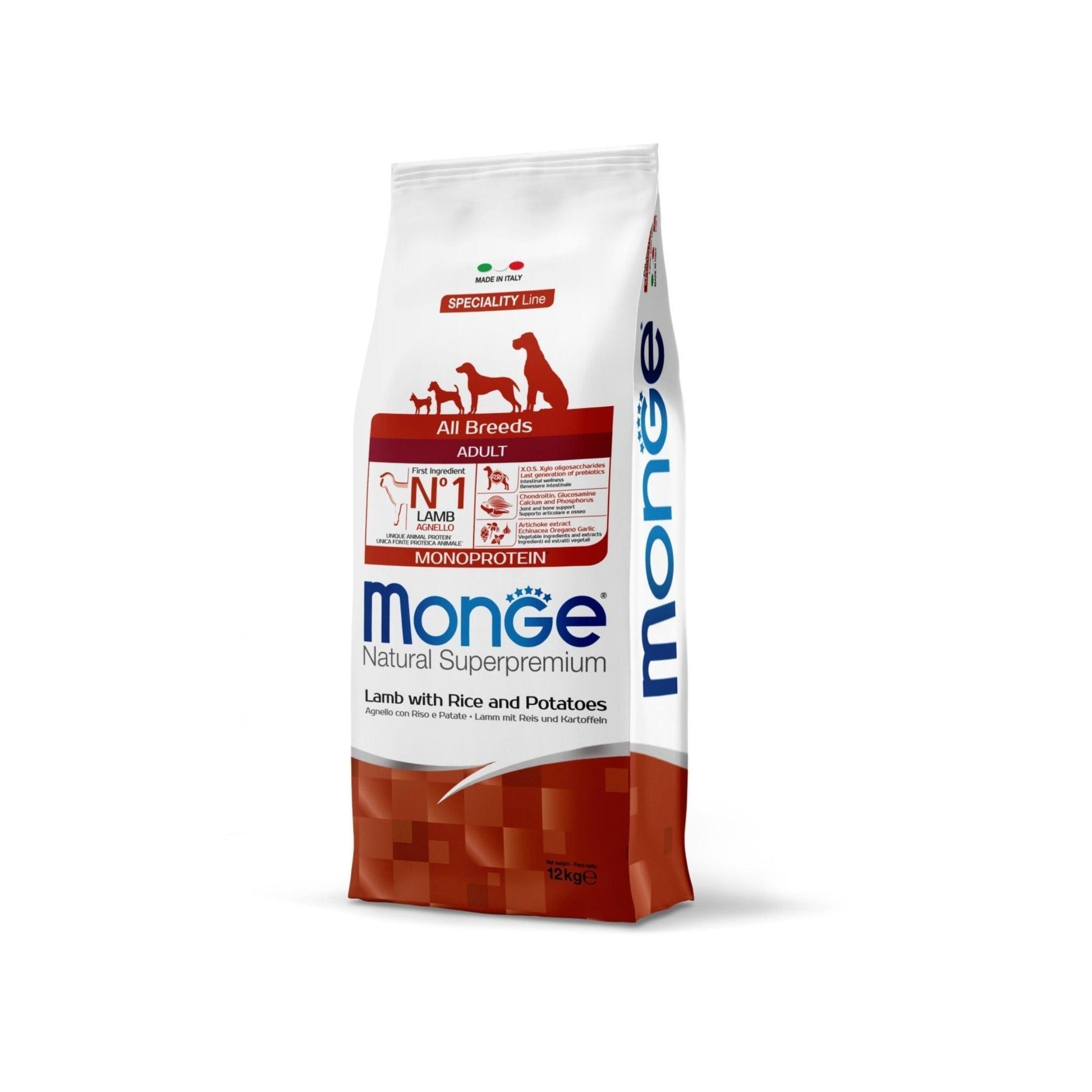 Monge Natural Superpremium All Breeds Adult Monoprotein Lamb with Rice and Potato — это полнорационный корм для взрослых собак всех размеров, предлагающий тщательно разработанную формулу для оптимального здоровья. Произведенный в Италии и разработанный с использованием высококачественных питательных веществ, этот корм включает в себя источник животного белка, в качестве основного ингредиента является ягнятина, что гарантирует высокую усвояемость и восхитительный вкус благодаря сочетанию свежего мяса. Рецепт дополнительно обогащен передовым пребиотиком XOS (ксилоолигосахаридом) для поддержания здоровья кишечника, а также растительными ингредиентами и экстрактами, такими как корень эхинацеи, орегано, чеснок и экстракт артишока. Кроме того, он содержит глюкозамин и хондроитин сульфат для поддержания здоровья суставов и костей. Эта формула не содержит искусственных красителей и консервантов, обеспечивая натуральное и сбалансированное питание для вашей собаки.